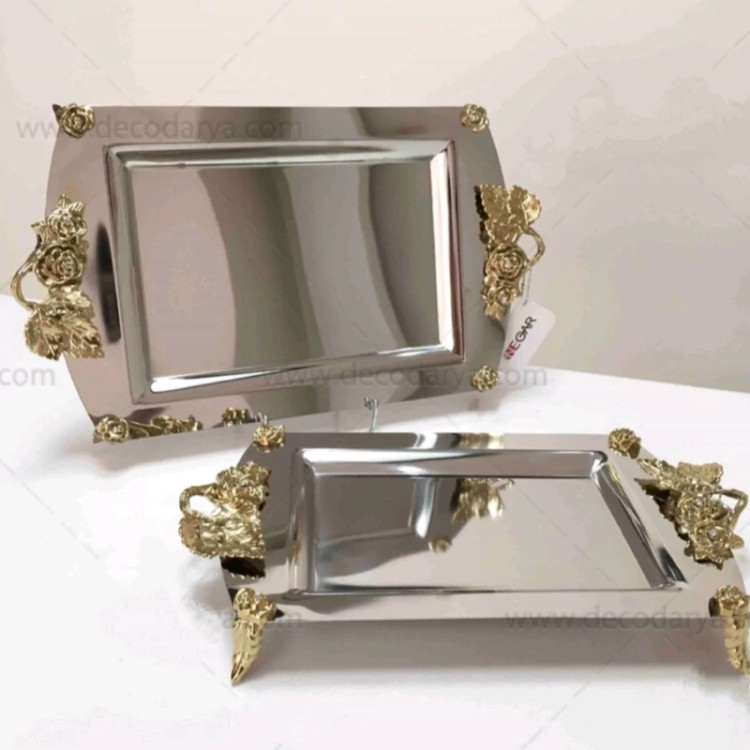 سینی نگار استیل نگیر دسته طلایی گل رز با 10 سال ضمانت تعویض